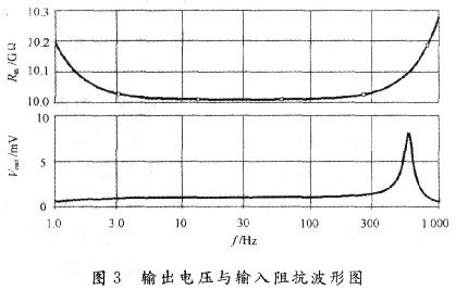 如圖3所示,圖中上半部分為系統(tǒng)輸出信號波形,下半部分為系統(tǒng)輸入阻抗波形,從圖中可以看出,在頻率為100 Hz處,測量系統(tǒng)的輸出電壓值Vout為10.011 mV,交流輸入阻抗Rin為1.132 8 GΩ。經(jīng)計算,系統(tǒng)的放大倍數(shù)A為100.998倍。