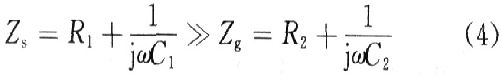 式中:Zs表示信號路徑的阻抗,Zg表示保護(hù)電路阻抗,本設(shè)計中,R2=100 kΩ,C2=1μF,Zs/Zg=1 000。