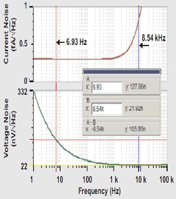 在第一項中,如果INA ≈ 0.01 fA/√HZ ,且RFB =270MΩ,則該項對輸出噪聲的貢獻(xiàn)值約為2.7 nV/ √HZ /5.85=0.5 nV/√HZ .
