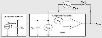 信號調(diào)節(jié)電路必須具有非低的輸入阻抗,以收集傳感器的大部分電荷輸出。因此,電荷放大器是理想的解決方案,因為只要放大器在這些信號頻率下保持高增益,其輸入便會讓傳感器信號出現(xiàn)虛擬接地。換句話說,如果傳感器的任何電荷想要在傳感器陽極(Cd)或者放大器輸入寄生電容(Ca)上增大,在放大器輸入端就會形成電壓。通過拉或吸取相同量的負(fù)反饋網(wǎng)絡(luò)電荷電流,即RFB和CFB,這種電壓便立即得到了補(bǔ)償。