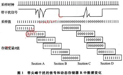 從單片機計數(shù)輸入端,觀察信號波形。為便于分析,在高、低電平段設(shè)置了幾個干擾尖峰脈沖,分別標(biāo)示為Section A和Section C,占空比信號下降沿、上升沿分別標(biāo)示為Section B和Section D。單片機按計數(shù)時鐘周期性采樣,采樣值中“1”表示采到的是高電平,“0”表示低電平。I/O口采樣占空比信號輸出端口中狀態(tài),利用1個字節(jié)型變量R來動態(tài)存儲采樣值??刂破髅坎蓸?次,變量R中數(shù)據(jù)向左移1個二進(jìn)制位,R原最高位電平狀態(tài)被移除,而當(dāng)前時刻新的采樣狀態(tài)保存到R的最低位,變量R被更新了,狀態(tài)存儲器R中保存著最近8個采樣周期的采樣值。