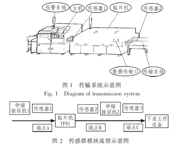 如傳感器流程示意圖1、圖2所示,假設(shè)一塊PCB的編號(hào)為01,首先從通過(guò)傳輸設(shè)備伸縮接駁機(jī)(編號(hào)為CS01)進(jìn)入設(shè)備貼片機(jī)(編號(hào)為TP01)進(jìn)行操作貼片流程,完畢之后再?gòu)馁N片機(jī)(編號(hào)為TP01)進(jìn)入傳輸設(shè)備接駁機(jī)(編號(hào)為CS02),再通過(guò)傳輸設(shè)備接駁機(jī)(編號(hào)為CS02)進(jìn)入下一個(gè)SMT生產(chǎn)設(shè)備,如此反復(fù)。