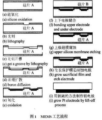 硅電容式壓力傳感器的敏感元件是半導(dǎo)體薄膜,它可以由單晶硅、多晶硅等利用半導(dǎo)體工藝制作而成。典型的電容式傳感器由上下電極、絕緣體和襯底構(gòu)成。當(dāng)薄膜受壓力作用時(shí),薄膜會(huì)發(fā)生一定的變形,因此,上下電極之間的距離發(fā)生一定的變化,從而使電容發(fā)生變化。但電容式壓力傳感器的電容與上下電極之間的距離的關(guān)系是非線性關(guān)系,因此,要用具有補(bǔ)償功能的測(cè)量電路對(duì)輸出電容進(jìn)行非線性補(bǔ)償。由于高溫壓力傳感器工作在高溫環(huán)境下,補(bǔ)償電路會(huì)受到環(huán)境溫度的影響,從而產(chǎn)生較大的誤差。基于模型識(shí)別的高溫壓力傳感器,正是為了避免補(bǔ)償電路在高溫環(huán)境下工作產(chǎn)生較大誤差而設(shè)計(jì)的,其設(shè)計(jì)方案是把傳感器件與放大電路分離,通過(guò)模型識(shí)別來(lái)得到所測(cè)環(huán)境的壓力。高溫工作區(qū)溫度可達(dá)350℃。傳感器件由鉑電阻和電容式壓力傳感器構(gòu)成。其MEMS工藝如下:
