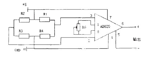 我們選用的高精度低噪聲儀用放大器AD620,可以用在傳感器輸出信號(hào)小的放大器中,如光電池傳感器、應(yīng)變片傳感器以及壓力傳感器等。由于它具有低噪聲、增益精度高、增益溫度系數(shù)小和高線性度等優(yōu)良性能。用于此系統(tǒng)中是非常理想的。AD620是一種只用一個(gè)外部電阻就能設(shè)置放大倍數(shù)為1-1000的儀表放大器,具有良好的直流性能和交流性能,AD620的體積小、功耗低成為應(yīng)用在壓力傳感器中的重要因素,傳感器信號(hào)放大電路如圖5所示。