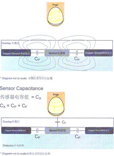 但是,這個在圖中標(biāo)為CF的附加手指電容值的數(shù)量級在0.1pF至10pF。雖然一根于指的存在會導(dǎo)致電容發(fā)生變化,但與寄生電容相比,該變化的幅度是相當(dāng)小的。而傳感器的測得電容值稱為CX。在沒有手指存在的情況下,CX基本上等于CP。而在于指存在時,CX則為CP和CF的和。