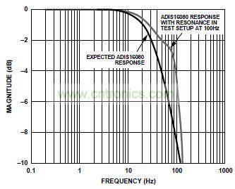 確定傳感器步進響應對于隔離在確定帶寬特性時觀察到的諧振條件很有用。圖1所示為一種采用ADIS16080的系統(tǒng)的頻率響應。圖中所示諧振頻率為100 Hz。開始時,該諧振到底是傳感器行為導致,還是系統(tǒng)中的機械諧振所導致,這并不清楚。幸運的是,步進響應(如自測功能所確定)可以區(qū)分這兩種效應。圖2顯示了兩種條件下的坐標曲線圖:測試設(shè)置導致的諧振和傳感器本身導致的諧振。