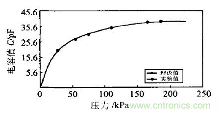 表1 可見,擬合的電容誤差小于1 %。由此可見,在不同的時(shí)刻測得UO ( t) ,通過曲線擬合得出參數(shù)RC。再給電路加小信號直流電源,測出R 值,即求得C ,通過C 值則可知被測環(huán)境的壓力。圖5為350 ℃時(shí),不同的壓力對應(yīng)的電容的理論值和實(shí)驗(yàn)值,從實(shí)驗(yàn)數(shù)據(jù)(表2) 可得,在測壓的過程中,利用模型識別的方法,誤差較小,其測壓誤差小于2 %。