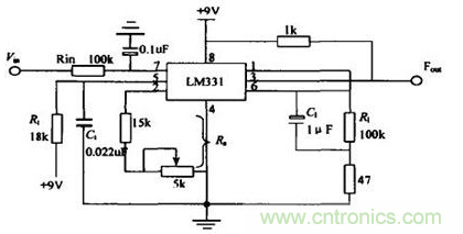 電阻Rs、R1、Rt和電容Ct直接影響轉(zhuǎn)換結(jié)果Fout,因此對(duì)元件的精度要有一定的要求,可根據(jù)轉(zhuǎn)換精度適當(dāng)選擇,其中Rt、Ct、Rs、R1要選用低溫漂的穩(wěn)定元件,Cin可根據(jù)需要選擇0.1uF 或1uF 。電容C1對(duì)轉(zhuǎn)換結(jié)果雖然沒(méi)有直接的影響,但應(yīng)選擇漏電流小的電容器。電阻R1和電容C1組成低通濾波器,可減少輸入電壓中的干擾脈沖,有利于提高轉(zhuǎn)換精度。電路中的47Ω 電阻對(duì)確保電路線(xiàn)性失真度小于0.03% 是十分必須的。