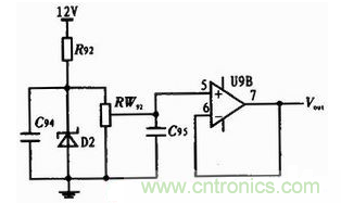 圖1中D2為穩(wěn)壓管,9V電源選用額定擊穿電壓為9.1 V的1N4696,1 V電源選用額定擊穿電壓為1.2 V的LM385;RW92是電位器,和穩(wěn)壓管并聯(lián)起到分壓的作用,滑動頭分別可得到9 V和1 V的電壓;運放在這里是電壓跟隨器,輸出電壓和電位器滑動頭處的電壓大小相等;R92是限流電阻,和穩(wěn)壓管串聯(lián);兩個電容是退耦電容,大小0.1 μF,起到穩(wěn)定電壓的作用。為了不影響穩(wěn)壓管工作電阻阻值不大于500 Ω,電阻功率不小于1 W。電位器阻值不小于10 kΩ。