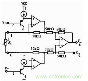 圖2中R11是采樣電阻,阻值10 kΩ,精度1‰;0 ℃時傳感器輸出電流273.15μA,電阻上的電壓2.731 5 V;100 ℃時傳感器輸出電流373.15 μA,電阻上的電壓3.731 5 V;由于溫度為0℃時傳感器器輸出不是0,因此放大前應先減去該零點電壓,該電壓常量見圖中VRef,由9V利用電位器RW11分壓后獲得,大小為2.731 5 V;0℃時運放輸入差分電壓(Vin-VRef)為0 V。圖中U1為儀表放大器,選用AD623,單電源供電,增益1~1 000,其結構圖如圖3所示,只需調節(jié)一個電阻RG即可改變增益,Vo=(1+100kΩ/RG)(V+~V-),輸出信號基準電平可以在一定范圍內任意給定(利用5腳REF端)。