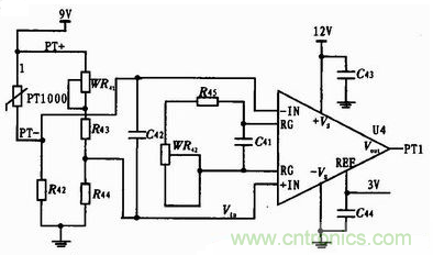 圖4中WR41是調零電位器;電橋的輸出直接連接運放AD623,其連接和調節(jié)增益方法和上節(jié)中相同這里不再介紹。調試時PT1000用電阻箱實現(xiàn)的,阻值由分度表獲得的。