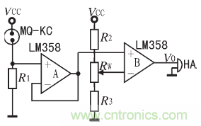 圖l中,R1是傳感器要求的負(fù)載電阻,阻值為120 Ω,Vcc為9 V電源電壓;A、B為LM358雙運放,A為跟隨器,起緩沖隔離作用,以便將R1上的電壓VR1基本上全部施加到比較器B的同相輸入端。RW為報警靈敏度調(diào)整電位器。穩(wěn)態(tài)時,調(diào)整RW使得加到比較器反相輸入端的電壓V-略高于穩(wěn)態(tài)時R1上的電壓VR1這個電壓越高,報警靈敏度就越低。加電并使傳感器達(dá)到穩(wěn)態(tài)后,MQ-KC為較穩(wěn)定的固定阻值,當(dāng)Vcc不變時,VR1基本為一固定值,保持不變。當(dāng)有可燃性氣體泄露時,傳感器接觸到可燃?xì)?,使其電?dǎo)率上升,電阻下降,使VR1上升,當(dāng)VR1高于V-時,比較器輸出一個大于7 V的電壓,從而使蜂鳴器HA發(fā)出滴、滴的報警聲。若用該電壓控制一個繼電器,即可實現(xiàn)控制功能。為了提高抗干擾能力,可分別在R1和B的V-端并聯(lián)一只濾波電容。