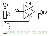 圖1所示的基本報警電路的不足:一開始加電時,傳感器尚未達(dá)到穩(wěn)態(tài),其電阻值較小,VR1較大,導(dǎo)致蜂鳴器HA誤報警。為了解決這一問題,采用一個數(shù)字信號控制的模擬開關(guān),其控制信號采用簡單的電容充電延時電路,原理圖如圖2所示。圖1中比較器B的輸出V0加到模擬開關(guān)4066的輸入端,開關(guān)的輸出端接蜂鳴器HA。初始加電時,電容C上的電壓VC為0,4066不導(dǎo)通,無論V0值為多高,HA都不會報警。隨著電容充電,VC不斷升高,當(dāng)達(dá)到4066的控制門限閾值時,4066才導(dǎo)通,即能進(jìn)入報警狀態(tài)。電容充電使其電壓達(dá)到4066的控制門限閾值時間即為延時時間。電容C和電阻R的取值可根據(jù)延時要求確定。為可靠起見,取RC=1/2T,T為傳感器初始穩(wěn)定時間。本裝置取R=l MΩ,C=100μF,即能實現(xiàn)可靠的延時。