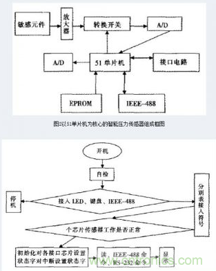 總體結(jié)構(gòu)設(shè)計(jì)。半導(dǎo)體敏元件、放大器、轉(zhuǎn)換開關(guān)、雙積分A/D轉(zhuǎn)換器、單片機(jī)、接口電路、IEEE~488標(biāo)準(zhǔn)接口、存儲器以及部分外圍電路組合在一起形成了智能壓力傳感器。