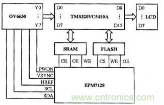 系統(tǒng)中的核心處理芯片選用TI公司的加強(qiáng)型定點(diǎn)DSP芯片TMS320VC5410A,該DSP的工作頻率可達(dá)160 MHz,內(nèi)部有64KBRAM空間可以靈活的映射為數(shù)據(jù)或程序存儲(chǔ)空間。由于DSP的內(nèi)部存儲(chǔ)空間有限,所以,本設(shè)計(jì)在外部擴(kuò)展了一大小為1 MB的SRAM數(shù)據(jù)存儲(chǔ)器CY7C1021和256 K的FLASH程序存儲(chǔ)器SST39VF400A??刂菩酒珻PLD選用Altera公司的MAX7000系列芯片EPM7128SLC84-15。該芯片包含84個(gè)I/O管腳、128個(gè)宏單元,每16個(gè)宏單元可組成一個(gè)邏輯陣列塊,工作電壓為5.0 V。該芯片在系統(tǒng)中處于總體時(shí)序控制地位,既用于給圖像傳感器芯片提供控制信號(hào)。也用于SRAM和FLASH的片選和讀寫控制,同時(shí)還負(fù)責(zé)LCD的顯示控制。