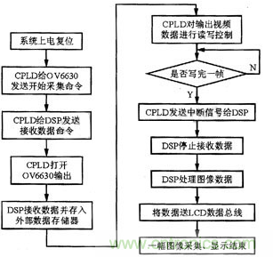由于圖像像素點(diǎn)的個(gè)數(shù)已知,即數(shù)據(jù)個(gè)數(shù)已知,故在計(jì)數(shù)完畢后,CPLD將發(fā)出計(jì)數(shù)完畢信號(hào)。而DSP在接收到中止信號(hào)后,即可開始讀取RAM中的數(shù)據(jù),并對(duì)數(shù)據(jù)進(jìn)行壓縮和相應(yīng)的處理,然后把數(shù)據(jù)放到LCD液晶屏的數(shù)據(jù)總線,最后將采集到的圖像在液晶屏上顯示出來。圖3為圖像采集系統(tǒng)的軟件流程圖。