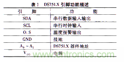 DS75LX工作電壓為1.7 V到3.7 V。除了基本的測溫功能外,DS75LX還具有溫度報警功能,允許用戶通過軟件設(shè)置報警溫度的門限值。DS75LX測溫范圍為-55℃~+125℃,當(dāng)測溫范圍為-25℃~+100℃時,測量精度為±2℃。DS75LX同時具有可編程的9至12位的溫度數(shù)據(jù)輸出格式。輸出的溫度數(shù)據(jù)為12位時,其分辨率可達(dá)0.0625℃。該傳感器具有三個地址引腳,可設(shè)置為三種狀態(tài)中的任意一種:接GND、VDD,或懸空,可設(shè)置27種地址組合。例如A2、A1和A0分別為接電源、接地和懸空時,DS75LX的器件地址為0101110。圖1是DS75LX的引腳排列,各功能描述如表1所示。