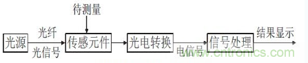 隨著工藝水平的提高,光纖技術(shù)目前相對成熟。光纖傳感器即為應(yīng)用光纖傳輸?shù)幕驹斫M合的一個廣電感應(yīng)系統(tǒng)。通常的光纖傳感系統(tǒng)由光源、光導(dǎo)纖維、光傳感元件,光調(diào)制元件和信號處理部分組成。其工作原理如下圖所示:光源發(fā)出的光經(jīng)過光導(dǎo)纖維進(jìn)入光傳感元件,而在光傳感元件中受到周圍環(huán)境場的影響而發(fā)生變化的光再進(jìn)入光調(diào)制機(jī)構(gòu),由其將傳感元件測量的參數(shù)調(diào)制成幅度、相位、偏振等信息,這一過程稱為光電轉(zhuǎn)換過程,最后利用微處理器進(jìn)行信號分析。