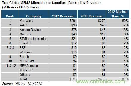 隨著市場的發(fā)展,MEMS麥克風市場的格局也在不斷的變化中。在HIS最新的分析報告顯示,樓氏電子繼續(xù)主宰MEMS麥克風市場,2012年以2.9億美元營收傲視所有其它供應(yīng)商,樓氏一家營收已實際占到整個MEMS麥克風市場的一半。中國AAC和歌爾聲學排名第二和第四,ST異軍突起,擠進前五。