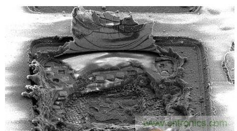 加州理工大學(xué)的工程師使用激光對芯片進(jìn)行打擊。芯片可以在晶體管遭受完全破壞后恢復(fù)過來。下面這個圖片由掃描電子顯微鏡拍攝。