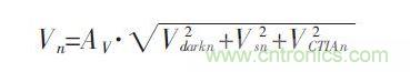 光電流散粒噪聲與照度有關(guān),很難消除。與暗電流有關(guān)的散粒噪聲可以通過改變摻雜濃度減小暗電流,但這會(huì)降低量子效率。在本電路中,In=100 fA,Is=20 pA,Tint=20 μs,C int =2 fF,則Vdarkn=0.28 mV,Vsn=4 mV。