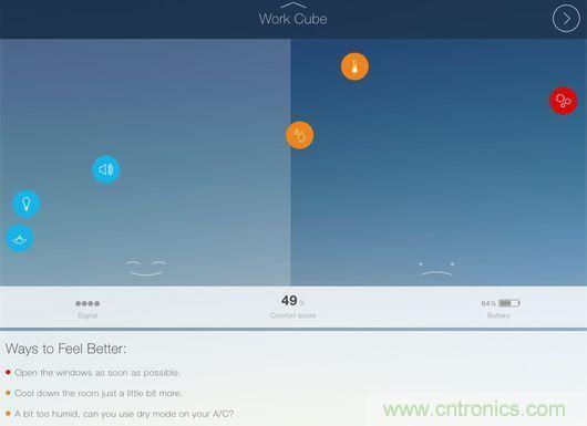 測試人員發(fā)現(xiàn),CubeSensors給出的這些信息較想象中更為有用。例如,產(chǎn)品提示一處起居室的溫度有點(diǎn)低,如果適當(dāng)提升溫度會讓人感覺更加舒適及放松。而在辦公室中,CubeSensors提示改善光照條件能夠幫助提升工作效率。在臥室中,產(chǎn)品給出了需要開窗以便改善空氣質(zhì)量的建議。用戶除了查看數(shù)據(jù)之外,還能看到應(yīng)用給出的實(shí)用建議,例如“盡快開窗”或“提升溫度會讓你感覺更加舒適”。盡管看起來似乎平淡無奇,但CubeSensors背后的團(tuán)隊(duì)表示,通過這些小建議,產(chǎn)品可以幫助用戶避免罹患感冒、過敏、頭疼等癥狀。