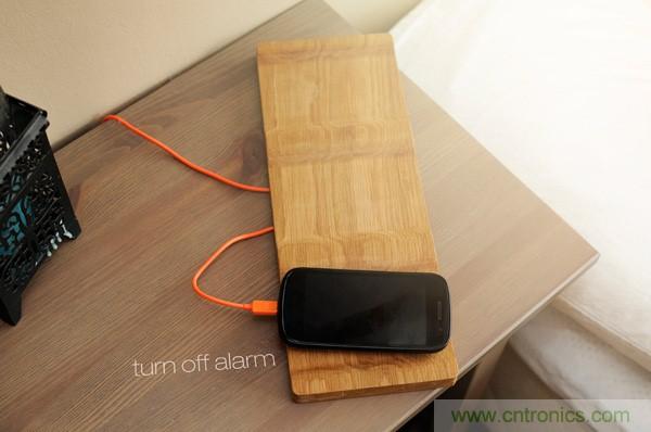 而Tangible Alarm的設(shè)計Tangible Alarm就像一塊長條形的木板,可以無線同步手機鬧鐘,通過簡單的移動手機,完成各種鬧鐘狀態(tài)的操作。Tangible Alarm共有三個移動的位置,包括小睡移動到右側(cè)、關(guān)閉移動到左側(cè)以及中間即是當前鬧鐘設(shè)置狀態(tài)。