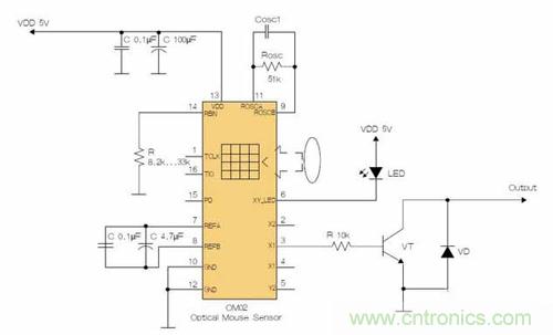 鼠標(biāo)芯片的CMOS光學(xué)傳感器可提供非機(jī)械式跟蹤引擎。在該芯片內(nèi)部可完成圖像的捕獲、數(shù)字化和數(shù)字處理。就拿簡單且低成本的OM02來說,該傳感器通過采集表面圖像幀來測量位置,并通過數(shù)學(xué)運(yùn)算判定運(yùn)動方向和距離。該傳感器安裝聚苯乙烯光學(xué)封裝中,設(shè)計用來與高亮度LED一起使用。它有一個完整且緊湊的跟蹤引擎;沒有活動部件,也不要求精密的光學(xué)對準(zhǔn)。OM02可以為X和Y方向運(yùn)動產(chǎn)生正交輸出信號。分辨率約為0.0025英寸,運(yùn)動速度最高為每秒16英寸。