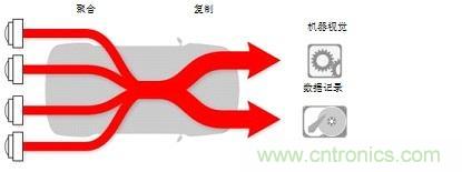 前置機器視覺攝像頭更是需要多個副本,但它將很快適用于自主車輛的附加攝像頭、雷達和光線檢測/測距(LIDAR)傳感器。數(shù)據(jù)記錄是一個當今非常常見的復制應用(圖1)。在機器視覺應用中,通常記錄某些行車狀況的原始傳感器數(shù)據(jù),以用于未來分析。這種情況下,擁有聚合原始傳感器數(shù)據(jù)的第二副本,并將其用于數(shù)據(jù)記錄,是大有裨益的;而另一個副本則用于機器視覺處理。