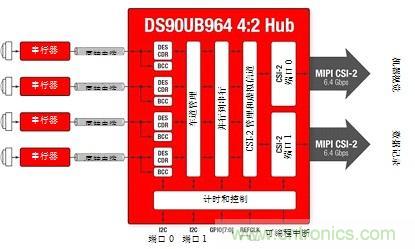圖3所示為四攝像頭系統(tǒng),具有由彩色塊所示的不同數(shù)據(jù)速率。聚合數(shù)據(jù)在移動工業(yè)處理器接口(MIPI)攝像頭串行接口(CSI)-2端口0和1兩者處呈現(xiàn)。CSI-2總線具有“突發(fā)性”,意味著其以固定數(shù)據(jù)速率運行、將發(fā)送數(shù)據(jù)為可用狀態(tài),并且當機器空閑時恢復到低功率(LP)狀態(tài)。因此,傳感器速度可在不改變ECU處理器時序的條件下進行變化。即使傳感器鏈路以獨立頻率運行,解串器集線器在單個參考時鐘上也可將數(shù)據(jù)提供給片上系統(tǒng)(SoC)處理器,從而簡化系統(tǒng)時序。