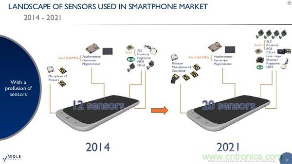根據(jù)有關(guān)機(jī)構(gòu)的預(yù)計(jì),2014年智能手機(jī)內(nèi)的平均傳感器數(shù)量為12顆,而到2021年這一數(shù)量將增加到20顆;除了一些必要的同類傳感器數(shù)量會(huì)增多之外,也有不少針對(duì)專業(yè)領(lǐng)域的機(jī)型會(huì)考慮搭載一些普通消費(fèi)者無法想象的傳感器。
