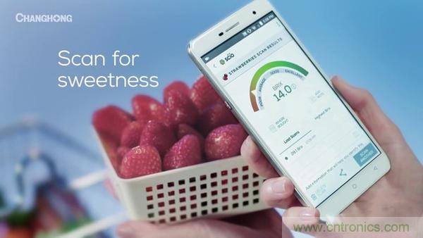合作方ADI主要為這款手機(jī)提供光譜傳感器以及相關(guān)的算法,CP公司則負(fù)責(zé)提供APP以及成分分析數(shù)據(jù)。在功能上,可以直接使用這款手機(jī)判斷分析水果中的成分、甜度等信息。此外,它還能對(duì)更多物體進(jìn)行成分分析,比如面包、肉以及藥物等。
