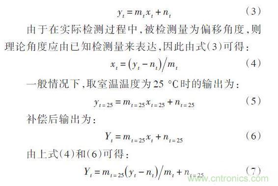 傳感器未經(jīng)溫度補(bǔ)償時(shí)的輸出為y = mx + n ,即在t ℃時(shí),無(wú)補(bǔ)償輸出為:
