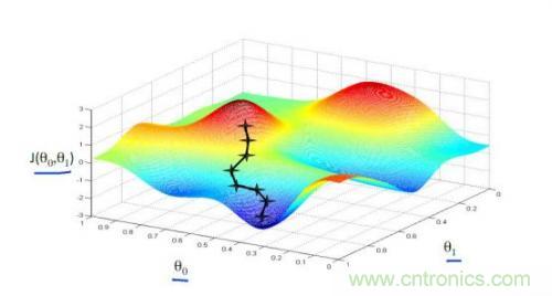 以上我們是以一維數(shù)據(jù)來看梯度下降,但我們的照片是多維數(shù)據(jù),此時如何求導數(shù)?又如何梯度下降呢?此時我們需要用到偏導數(shù)的概念。其實它與導數(shù)很相似,因為x是多維向量,那么我們假定計算Xi的導數(shù)時,x上的其他數(shù)值不變,這就是Xi的偏導數(shù)。此時應用梯度下降法就如下圖所示,θ是二維的,我們分別求θ0和θ1的導數(shù),就可以同時從θ0和θ1兩個方向移動相應的步長,尋找最低點,如下圖所示: