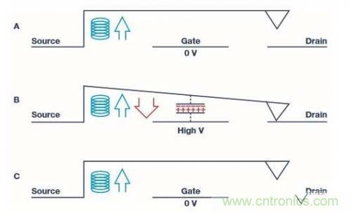 請(qǐng)注意,即便是在開啟位置上,開關(guān)梁仍然會(huì)有將開關(guān)往上拉動(dòng)的彈簧力(藍(lán)色箭頭),但是只要向下拉動(dòng)的靜電力量比較大,那么開關(guān)就會(huì)維持在開啟的狀態(tài)。 最后,當(dāng)閘極電壓被移除時(shí)(圖一中的C狀況),也就是在閘極電極上0 V,靜電吸引力也會(huì)跟著消失,而開關(guān)梁會(huì)以具有足夠回復(fù)力(藍(lán)色箭頭)的彈簧而動(dòng)作,開啟源極與汲極之間的鏈接,然后回返至原本的關(guān)閉位置。