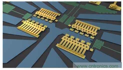 圖三中所示為四組在單刀四擲(SP4T)乘法器組態(tài)設(shè)定下的MEMS開關(guān)。 每組開關(guān)梁具有五組并聯(lián)的奧姆接點(diǎn),用以在開關(guān)關(guān)閉時(shí)降低電阻與提高電力的處理。