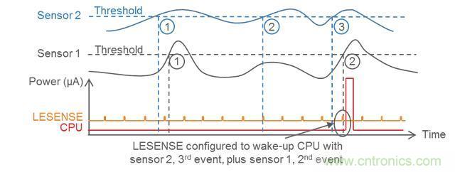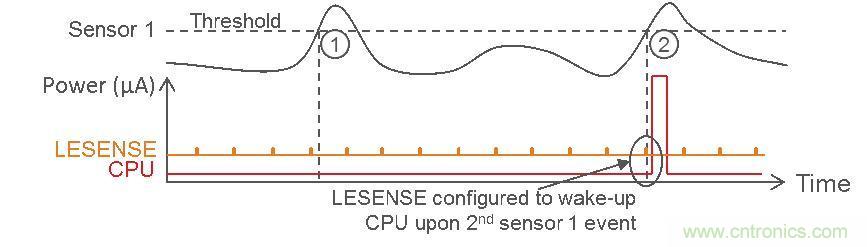 在以下概念圖中,LESENSE 被配置為允許傳感器 1 超過(guò)其可配置閾值兩次之后才喚醒 CPU。