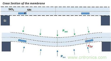 在制造該器件的過程中,創(chuàng)制了一個傳感膜。當膜彎曲時,波導的位置發(fā)生變化,從而引起光路延伸,導致該特定臂發(fā)生相移(圖2)。