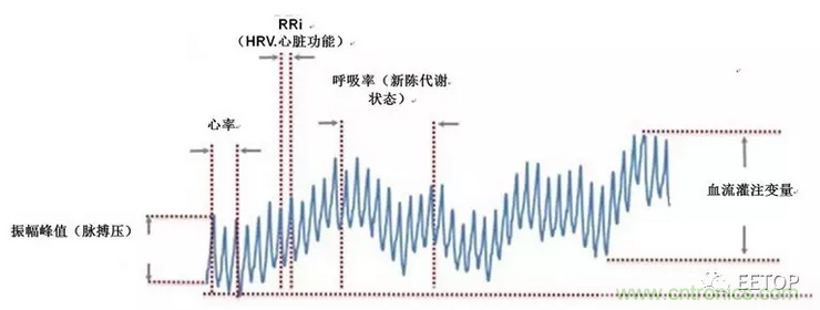 光學心率傳感器可生成測量心率的PPG波形并將該心率數據作為基礎生物計量值,但是利用PPG波形可以測量的對象遠不止于此。盡管很難取得和維護精確的PPG測量結果(我們將在下一篇詳細論述它),但是如果您能夠成功獲得精確的PPG測量結果,它將發(fā)揮強大的作用。高品質PPG信號是當今市場需求的大量生物計量的基礎。圖2是經過簡化的PPG信號,該信號代表了多個生物計量的測量結果。