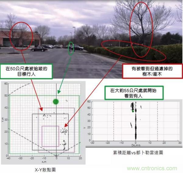 圖2顯示了使用毫米波技術(shù)的入侵探測(cè);毫米波傳感器分析場(chǎng)景中物件的速度,過(guò)濾出移動(dòng)背景中的運(yùn)動(dòng),僅追蹤人物。