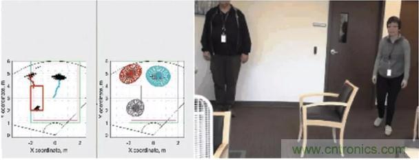 圖4:使用毫米波傳感器執(zhí)行分類(lèi)的范例:中間圖上所有移動(dòng)目標(biāo)都分配了一個(gè)軌道,其中的每個(gè)彩色區(qū)域代表一個(gè)人