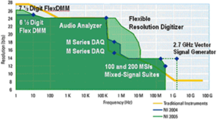 基本上,虛擬儀器系統(tǒng)是基于軟件的,所以如果只要是可以數(shù)字化的東西,就可以對(duì)它進(jìn)行測(cè)量。因此,測(cè)量硬件可在通過(guò)兩根坐標(biāo)軸進(jìn)行評(píng)估,即分辨率(位)和頻率。參考下圖可以看出虛擬儀器硬件測(cè)量性能與傳統(tǒng)儀器的比較。NI的目標(biāo)就是將曲線在頻率和分辨率上延伸并且在曲線內(nèi)進(jìn)行不斷推陳出新。