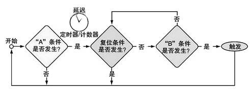 源自電腦編程領(lǐng)域的IF-THEN-ELSE構(gòu)成了這類觸發(fā)結(jié)構(gòu)的概念模型。如圖1所示,這些語句還包括其它判定符(如A和B之間的定時器/計數(shù)器)。不管B事件是否發(fā)生,在A事件之后隨時都可以發(fā)生復(fù)位。
