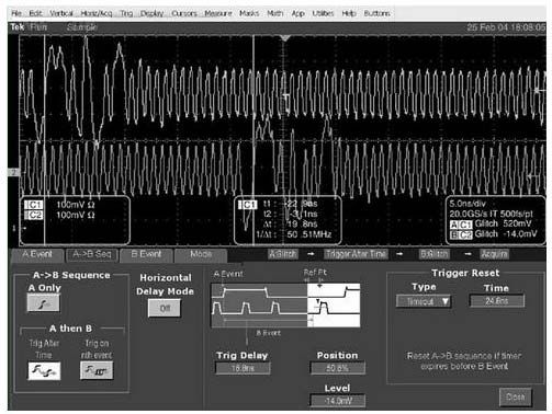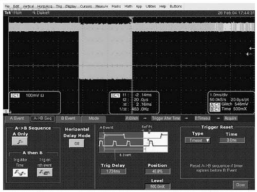 在這一過程中,A事件啟動延遲計數(shù)器,計算脈沖數(shù)量。一旦產(chǎn)生了32個脈沖,它會使B觸發(fā)器監(jiān)測第33個脈沖。當(dāng)檢測到特定脈寬時,B系統(tǒng)便設(shè)成觸發(fā)采集,這時,示波器觸發(fā)并記錄數(shù)據(jù)。如果沒有第33個脈沖,復(fù)位條件會重新準(zhǔn)備A觸發(fā)器,再次啟動整個流程。