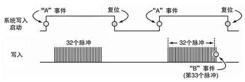 本系統(tǒng)中,讀/寫電路中的一個單元設(shè)計成在每個有效系統(tǒng)寫入啟動(WE)周期中執(zhí)行一串32條寫入命令。圖2描述了較大的周期時間與導(dǎo)致數(shù)據(jù)寫入的各個脈沖的關(guān)系。
