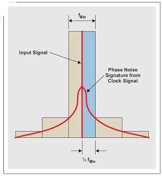 在采樣過程中,輸入信號與采樣時鐘信號混頻在一起,包括其相位噪聲。當進行輸入信號 FFT 分析時,主 FFT 容器 (bin) 集中于輸入信號。采樣信號周圍的相位噪聲(來自時鐘或輸入信號)決定了鄰近主容器的一些容器的振幅,如圖 7 所示。因此,小于 1/2 容器尺寸的偏頻的所有相位噪聲都集中于輸入信號容器中,且未增加噪聲。因此,相位噪聲整合帶寬下限應(yīng)設(shè)定為 1/2 FFT 容器尺寸。 FFT 容器尺寸計算方法如下: